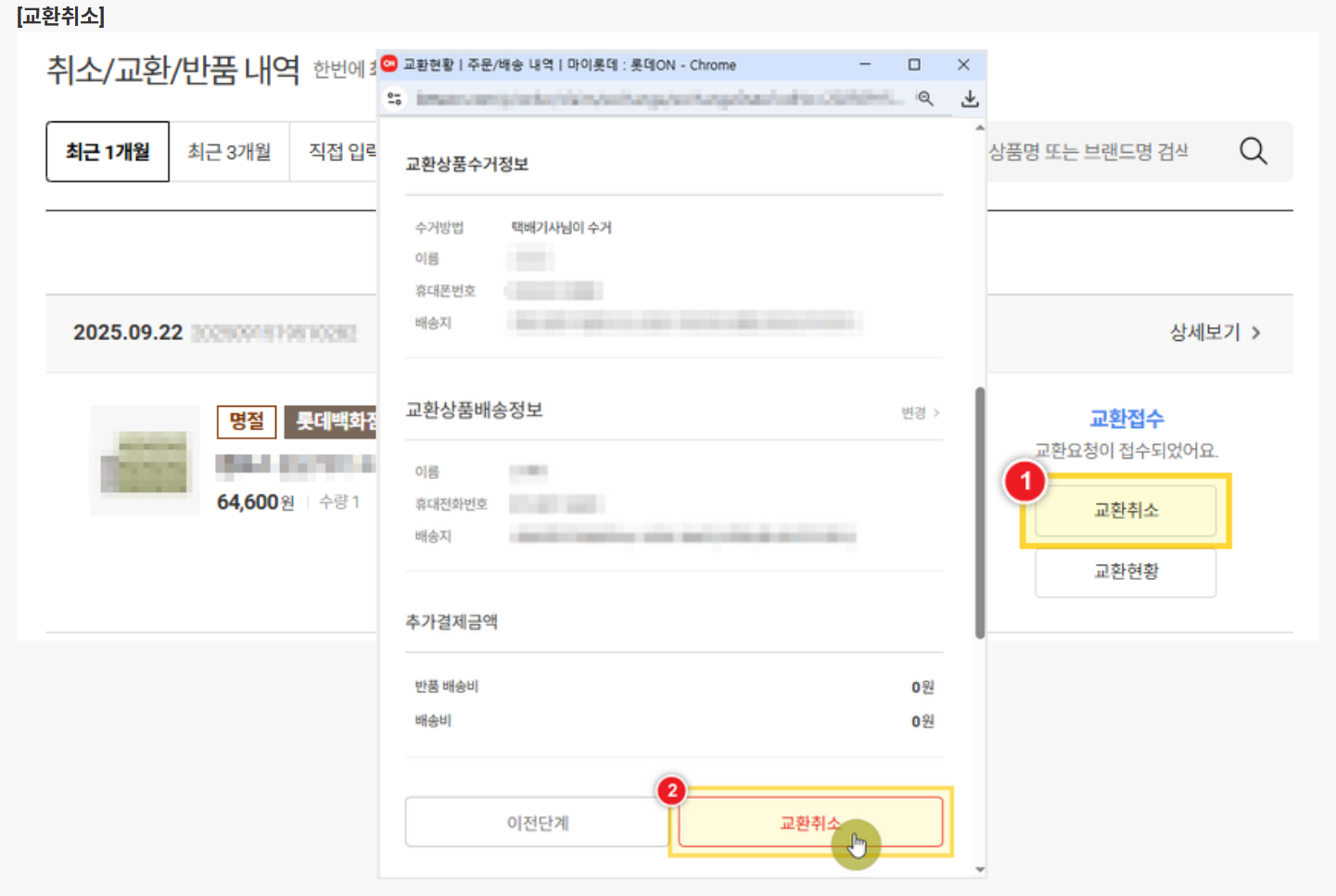 A. 마이롯데 > 주문/배송 내역 > 취소/교환/반품 내역에서 교환취소 후 반품접수 가능합니다.