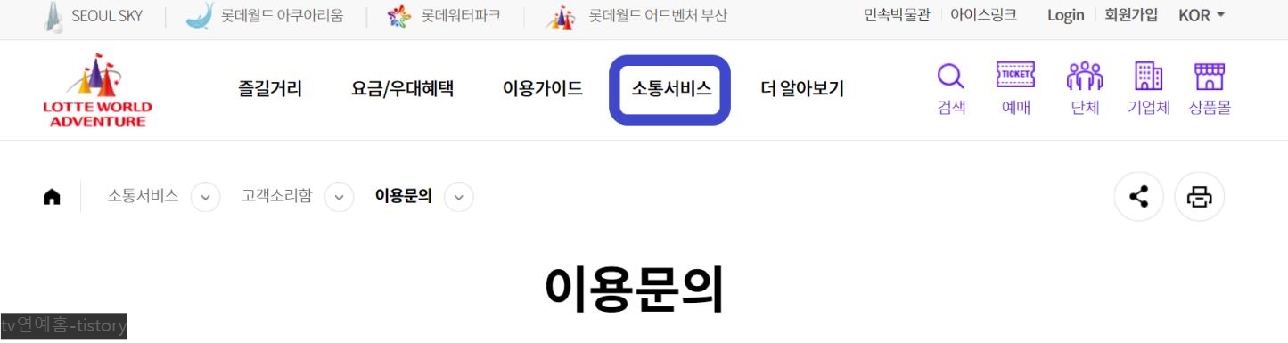 홈페이지 첫화면 상단 메뉴에 보면 소통서비스라는 메뉴가 있습니다. 여기에 접근하면 공지사항, FAQ, 고객소리함이 있는데 여기에서 고객소리함을 터치하면 롯데월드 이용에 대한 궁금한 사항을 남기는 경우 1주일 이내 이메일로 회신을 받을 수 있습니다.