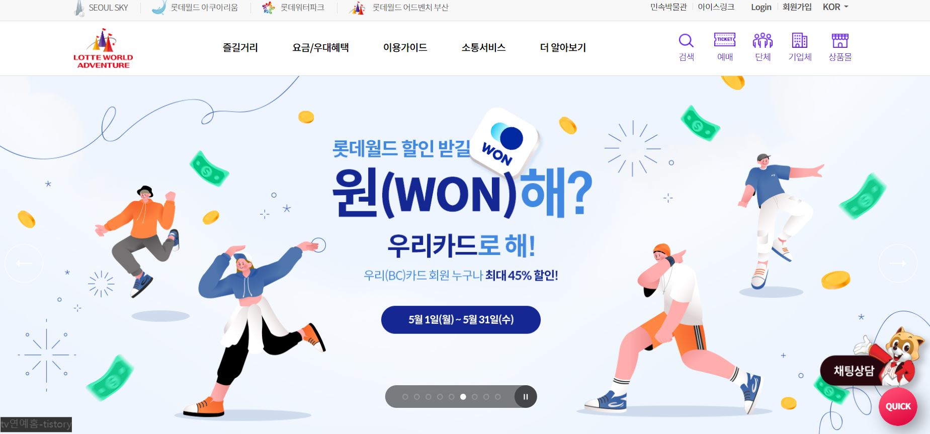 구글이나 평소 이용하는 홈페이지 검색창에 롯데월드를 입력하고 검색하면 롯데월드 홈페이지 주소가 나옵니다. 롯데월드 홈페이지 주소에 접근하면 아래와 같이 홈페이지 첫 화면을 볼 수 있습니다.
