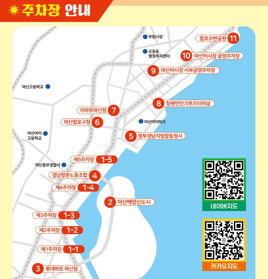 | 2 마산해양신도시 주차장 | 마산합포구 해안대로 180 18시까지 입차, 20시까지 출차 11/5(수) 19시까지 입차, 21시까지 출차 |