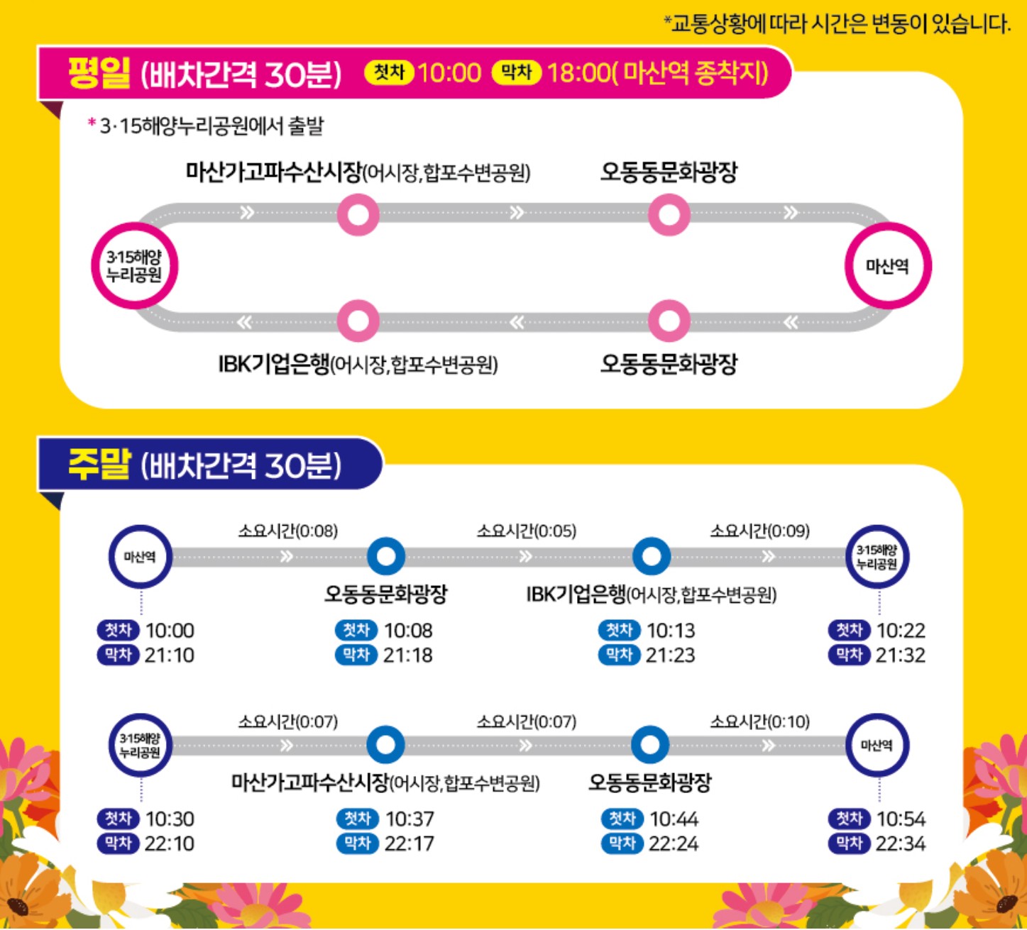 마산역 ↔ 오동동문화광장 ↔ IBK기업은행/합포수변공원 ↔ 3.15 해양누리공원(제1축 제장) ↔ 마산 가고파 수산시장/합포수변공원(제2축 제장) ↔ 오동동문화광장
