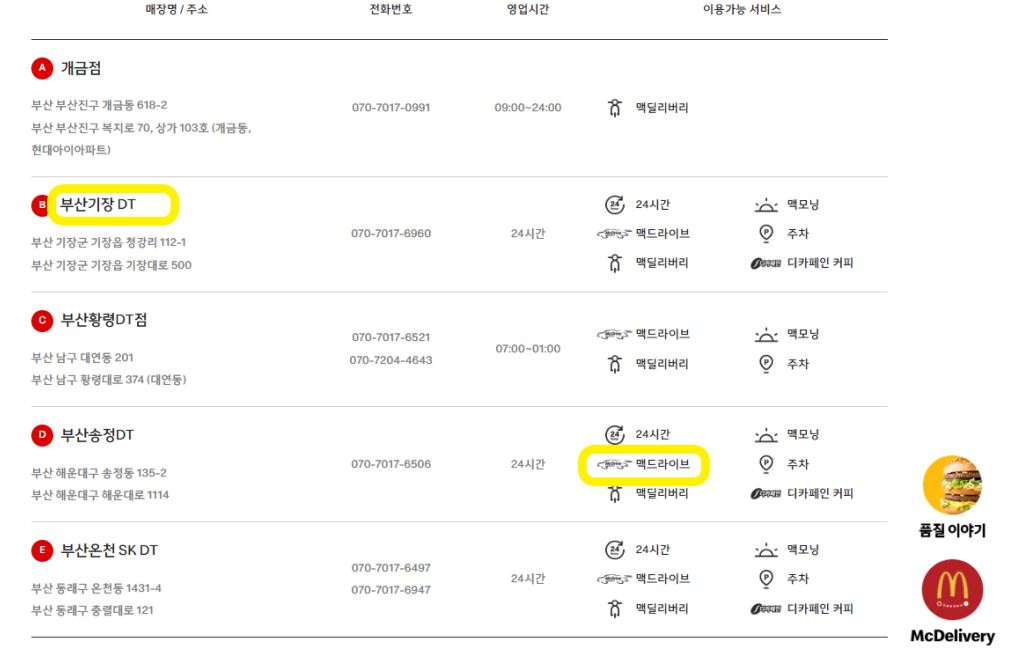 아래처럼 맥드라이브 전국 매장 찾기 사이트에서 검색하면 나옵니다.