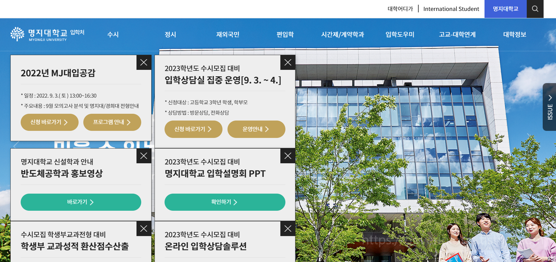 이 포스팅에서는 명지대 입학처 홈페이지에 바로 접속하는 방법과, 홈페이지에서 볼 수 있는 정보에 대해 알려드립니다.