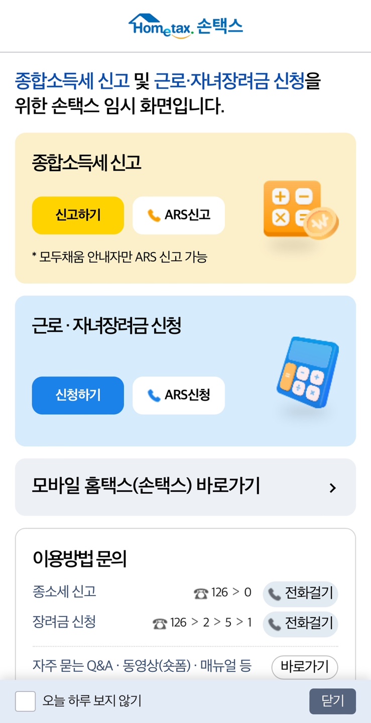 * 국세청 모바일 홈택스 [손택스] - 국세상담센터 (국번없이) 126 국세청 모바일 홈택스 [손택스] 앱에서는 회원가입, 세금신고·납부, 국세민원, 장려금 신청, 연말정산간소화 서비스, 현금영수