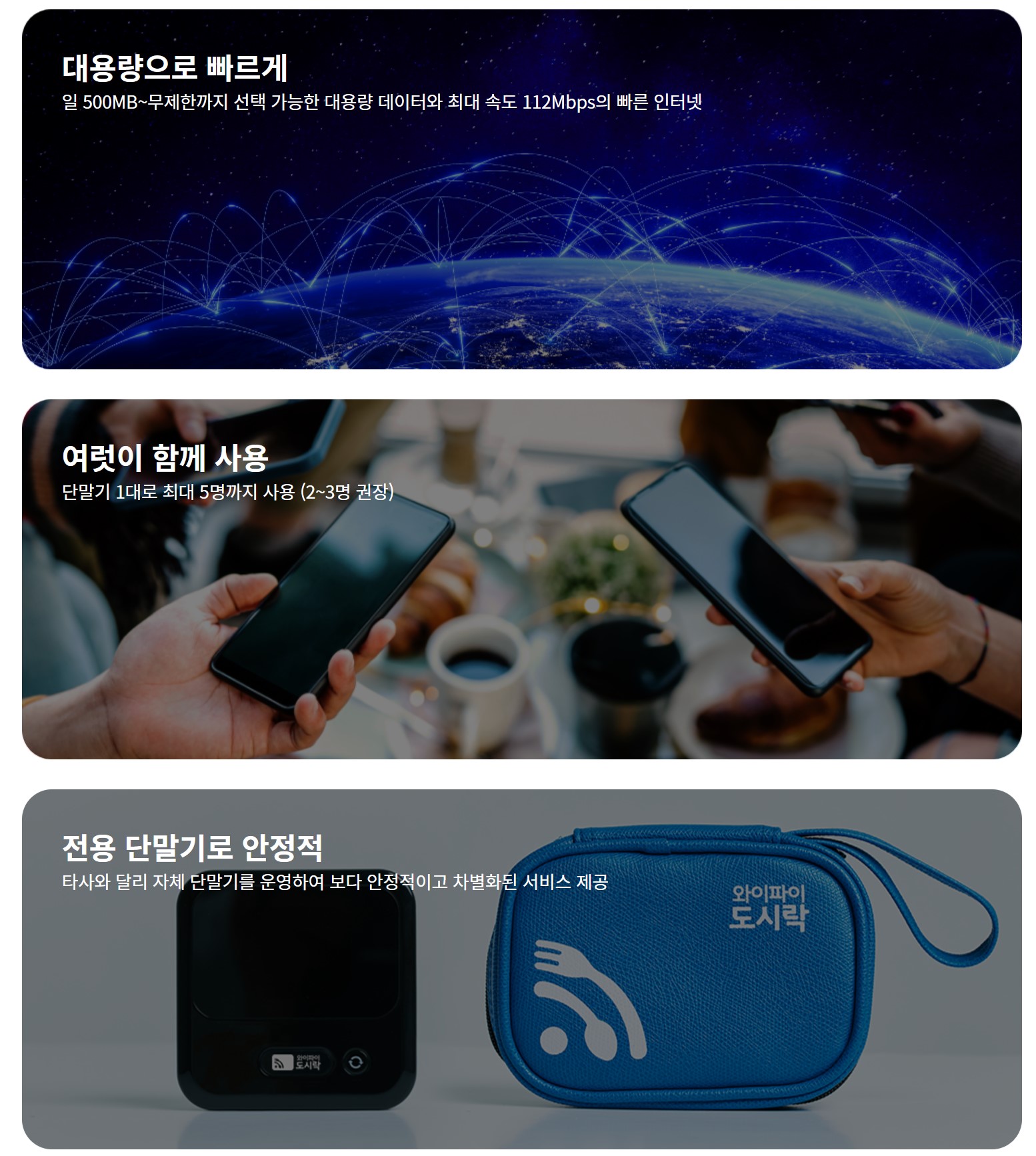 현재 와이파이 도시락 이용 누적 회원 수는 1,600,000명이며 누적 이용 수는 6,000,000명입니다. 와이파이 도시락의 장점은 아래와 같아요.