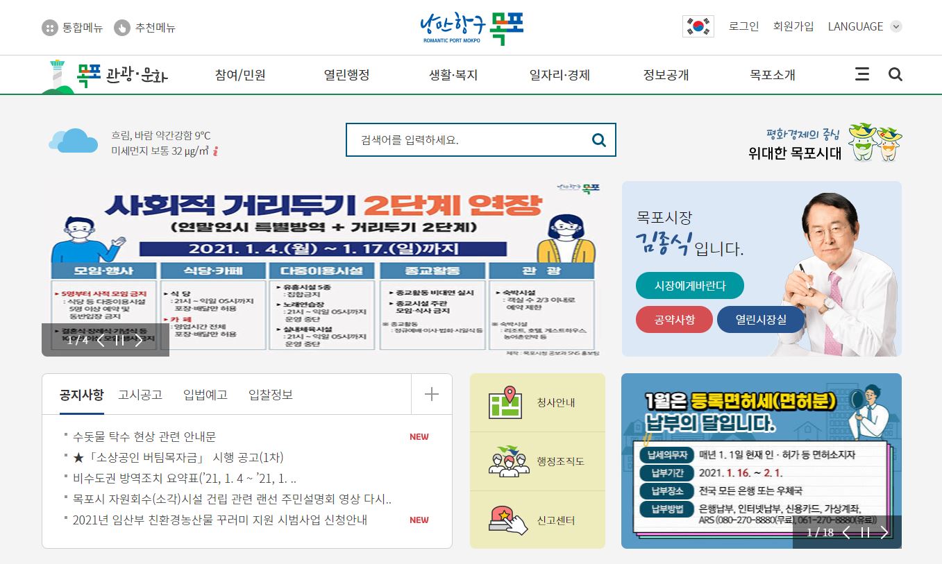 목포시청 홈페이지의 첫화면입니다.