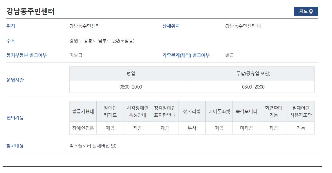 제가 거주하는 강원도 강릉시 강남동을 검색해봅니다. 여기는 워낙 작은 동네라 강남동주민센터에만 있네요- 근데 저희 할머니는 근처 마트 1층에 있어서 거기로 갔어요 ㅋ