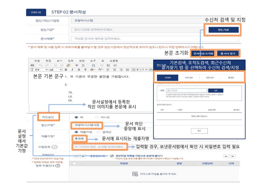 문서를 작성하기 전 세 가지 항목(작성 가능한 문서인지, 받는 기관 지정, 발신자명 표시)을 확인하고 모두 체크 후 문서 작성이 가능합니다. 파일첨부 시 500MB까지 가능하며 작성한 문서는 임시보관 및 PDF 형태로 확인이 가능하며 수신처로 발송 가능합니다.