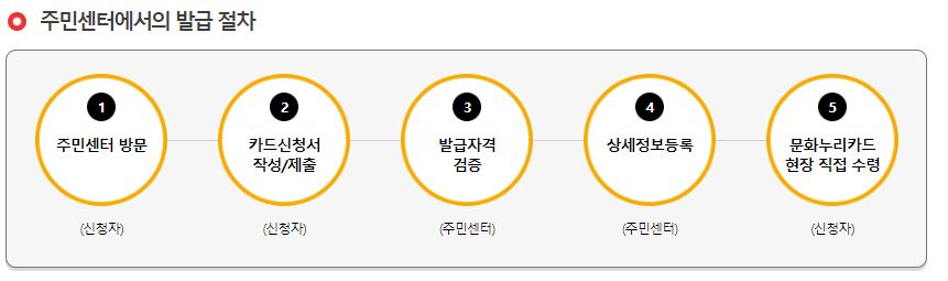 (주민센터 방문) 주민센터 방문 후 "문화누리카드 발급하러 왔습니다." 라고 요청하면 카드신청서 작성 후 자격 확인을 한다음 현장에서 바로 직접 수령합니다.