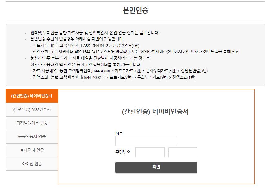 문화누리카드는 본인인증절차를 거친 후 잔액확인을 할 수 있습니다. (간편인증, 공동인증, 휴대전화인증, 아이핀 등)