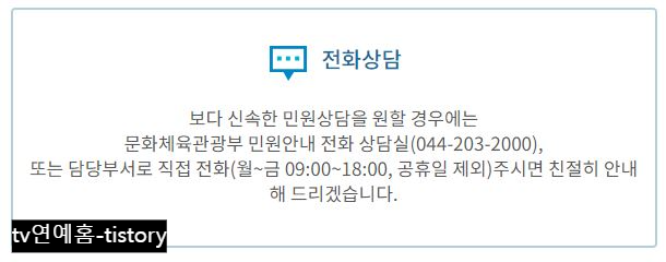보다 신속한 상담을 원하는 경우에는 문체부 민원안내 전화상담실이나 담당부서로 직접 전화할 수도 있으며 이용 가능시간은 월~금 09:00~18:00, 공휴일 제외입니다.