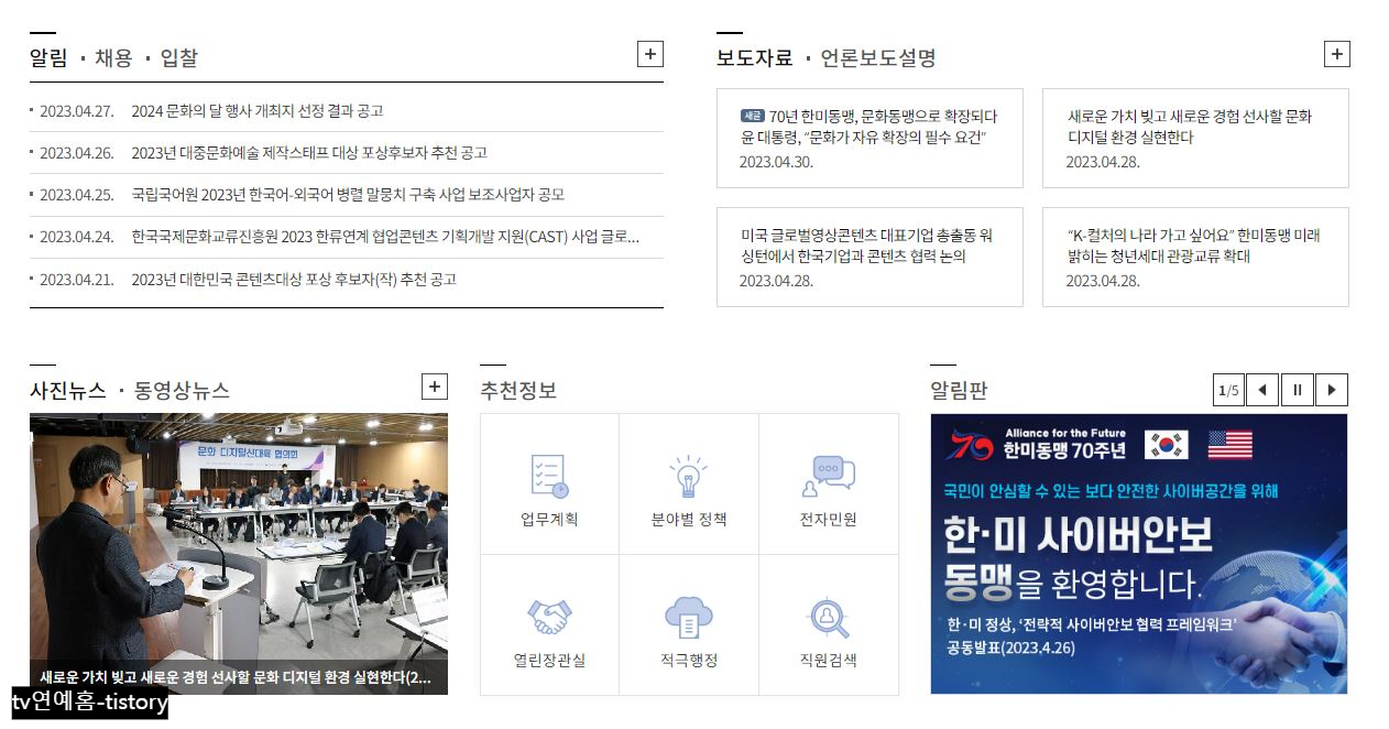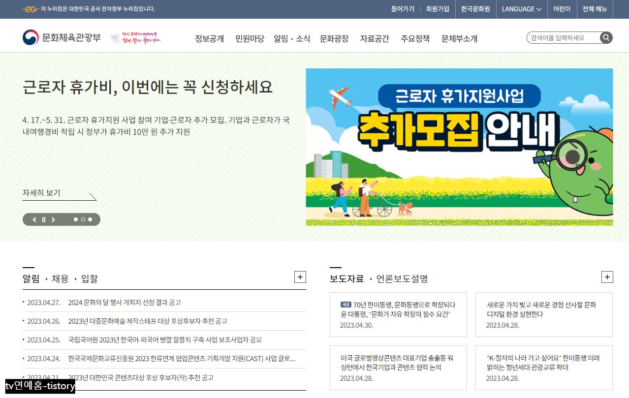 하단 문체부 홈페이지 바로가기에서 문체부 홈페이지 이용이 가능하며 이용중 문의사항은 아래 댓글창에 남겨주심 답변을 드립니다.