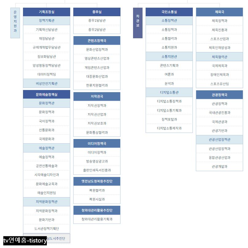 문화체육관광부에는 기획조정실, 종무실, 콘텐츠정책국, 문화예술정책실, 저작권국, 미디어정책국, 옛 전남도청복원추진단, 청와대관리활용추진단, 국민소통실, 체육국, 관광정책국이 있습니다.