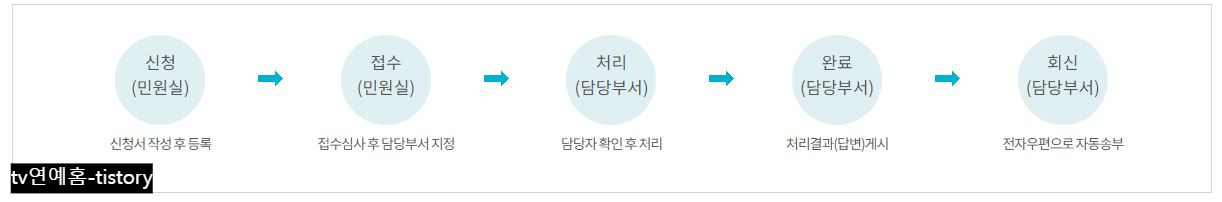 문화체육관광부 민원신청은 문화체육관광부 홈페이지 첫 화면에서 민원마당> 전자민원> 민원안내순으로 접근하면 이용 가능합니다. 문화체육관광부 민원신청은 직접 민원실에 방문한 것처럼 편하게 서비스를 이용할 수 있으며 민원처리절차는 아래와 같습니다.
