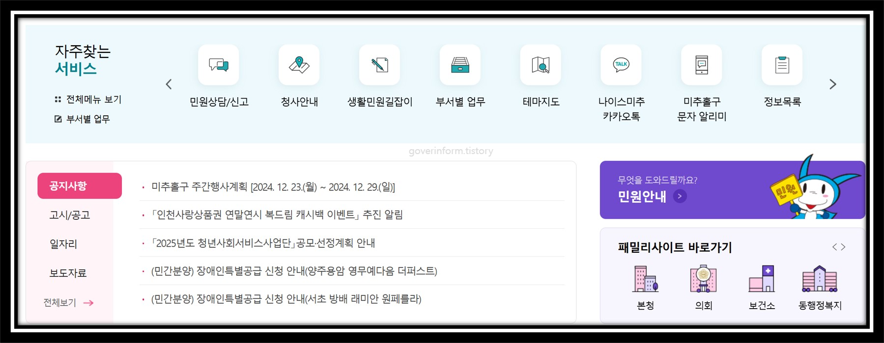 미추홀구청 홈페이지에서도 다양한 민원서비스를 이용할 수 있어요.