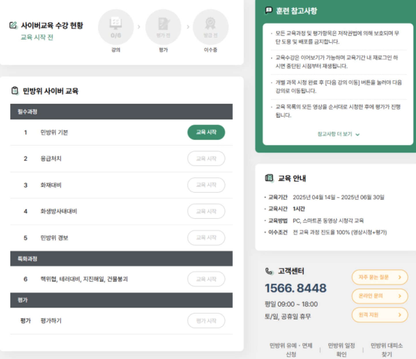 1. 필수과정: 민방위 기본, 응급처치, 화재 대비, 화생방사태 대비, 민방위경보