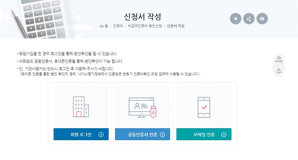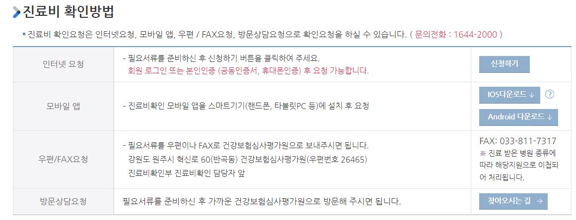 인터넷으로 바로 진료비 확인요청을 할 경우 회원 로그인이나 본인인증(공동 인증서, 휴대폰 인증) 후 요청이 가능합니다.