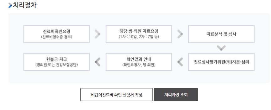 비급여 진료비 처리절차는 진료비 확인요청 후 해당 병의원에 자료를 요청하고 자료를 해당 병원에서 분석 및 심사를 한 후에 확인 결과를 통보해주는 방식으로 진행되며, 환불금이 있을 경우 병의원이나 건강보험공단에서 환불금을 환자에게 지급합니다.