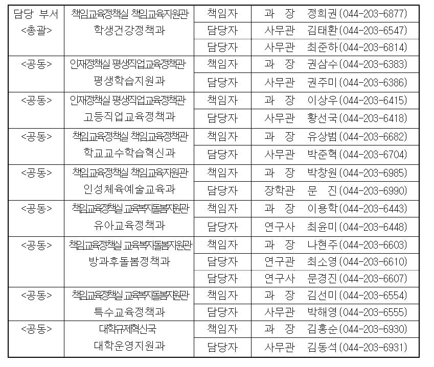 □ 한편, 자가진단앱·발열검사·소독·환기 등 방역체계를 정하고 있는 '학교방역지침'은 코로나19 감염 추세 등을 살펴보면서 학교현장 의견 수렴, 방역당국 협의 및 전문가 자문등을 통해 보완하고 추가 안내할 계획입니다.