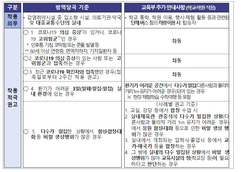 등교, 등원을 위한 대중교통수단 이용 시, 통근 또는 통학차량 이용시, 수학여행, 현장 체험학습을 위한 버스 이용시 마스크 착용이 의무임