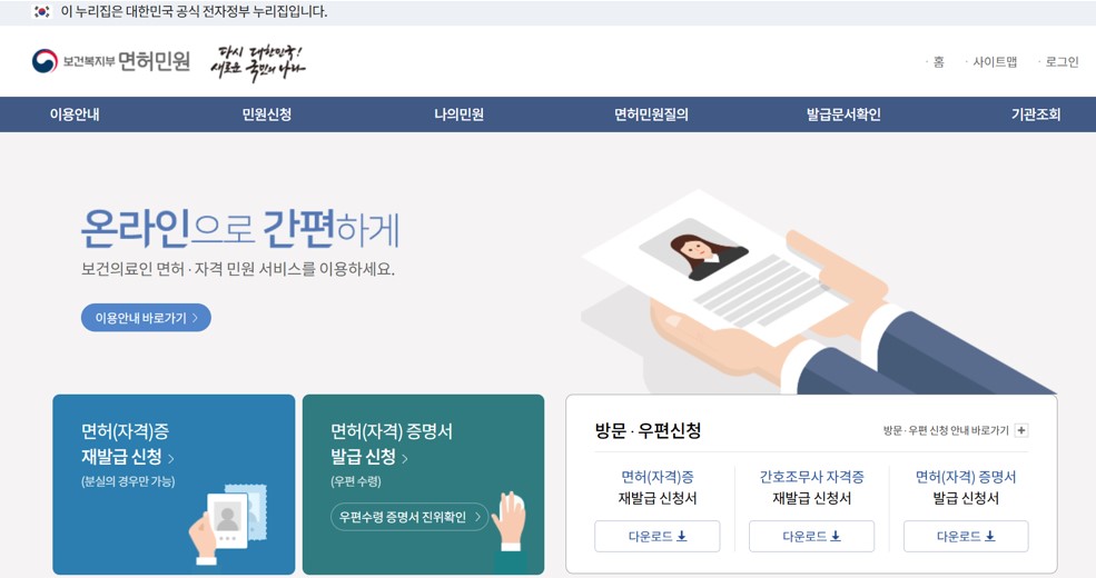 보건복지부 면허민원 누리집입니다.