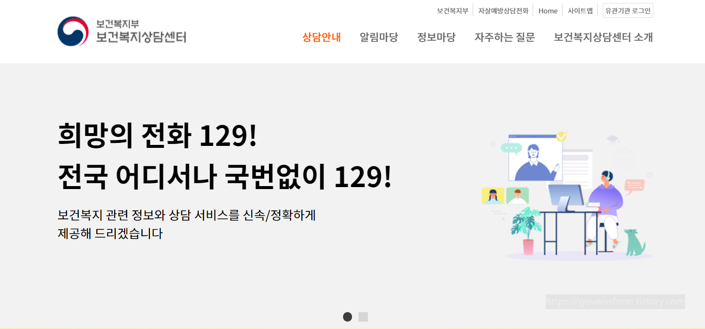 2. 빈번하게 이용되는 전화상담이용방법입니다. 전화번호 129로 전화를 걸면 보건복지 관련 상담을 받을수 있습니다. 급한상황이 아니더라도 모든 보건, 건강과 관련된 정보에 대한 궁금증이 있는분들은 이용해도 됩니다.