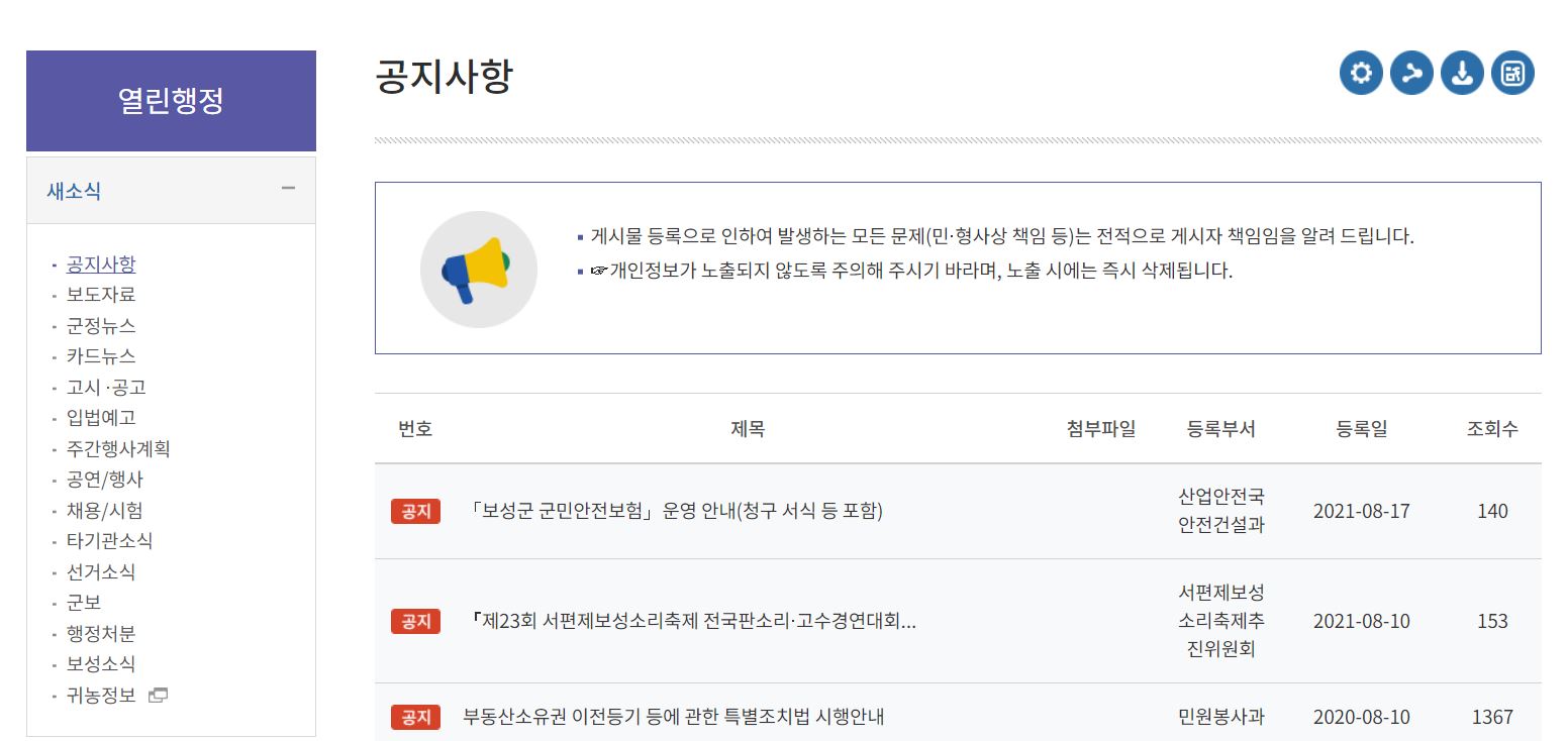 보성군청 홈페이지의 새소식 그리고 공지사항을 볼 수 있습니다.