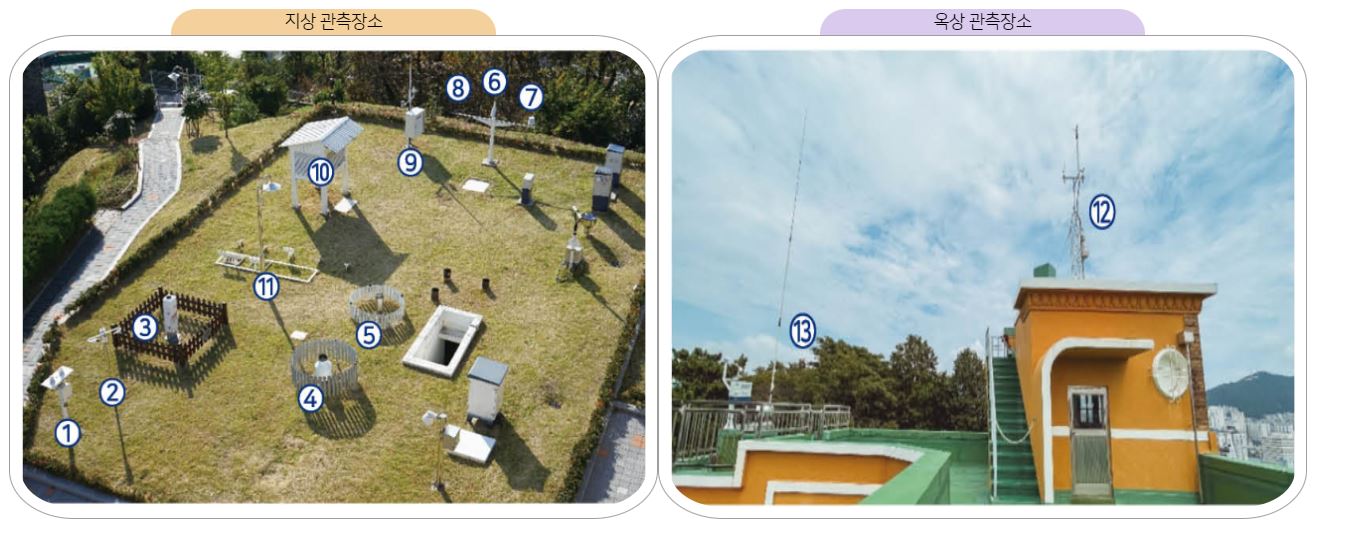 부산지방기상청이 사용하는 기상관측장비는 지상, 옥상에 있습니다. 자외선측정기, 시정현천계, 운고 운량계, 강수량계(무게식, 전도형), 레이저식 적설계, 습도계, 강우감지계, 낙뢰관측장비, 백엽상, 지면 온도계, 초상 온도계, 지중 온도계, 철관지중 온도계, 풍향 풍속계, 일조 일사계가 있습니다.