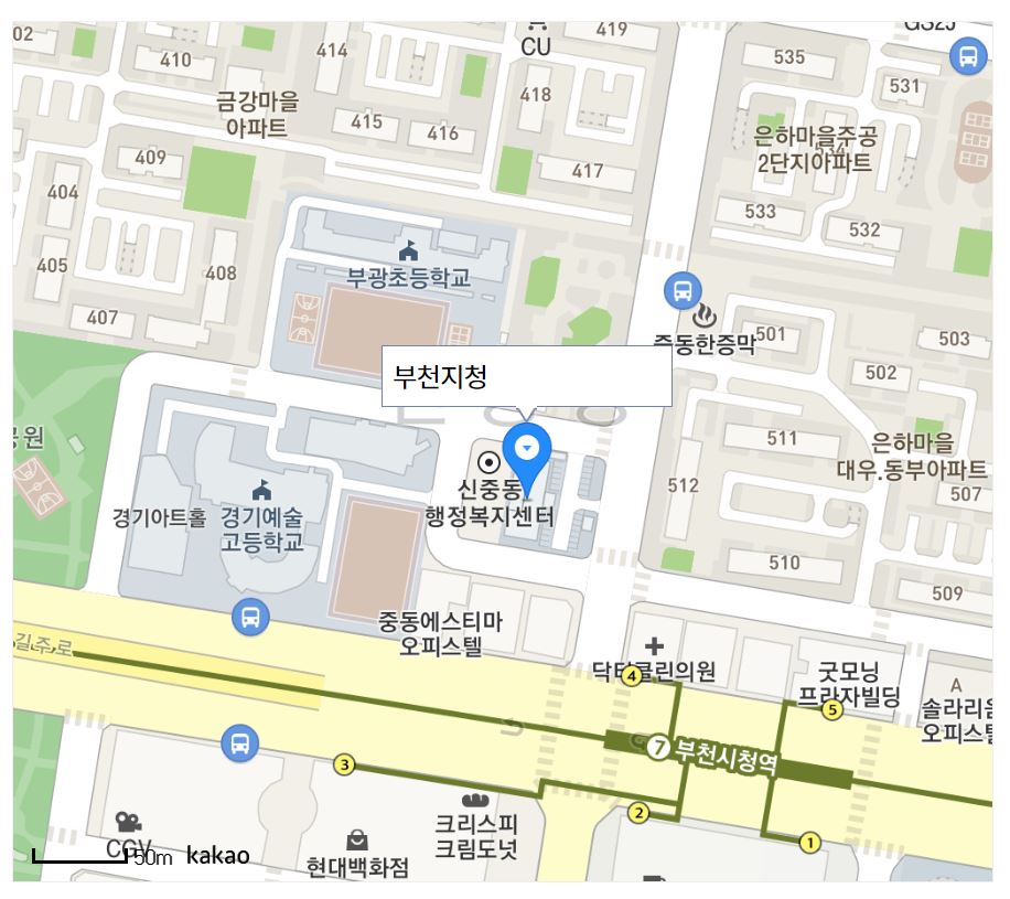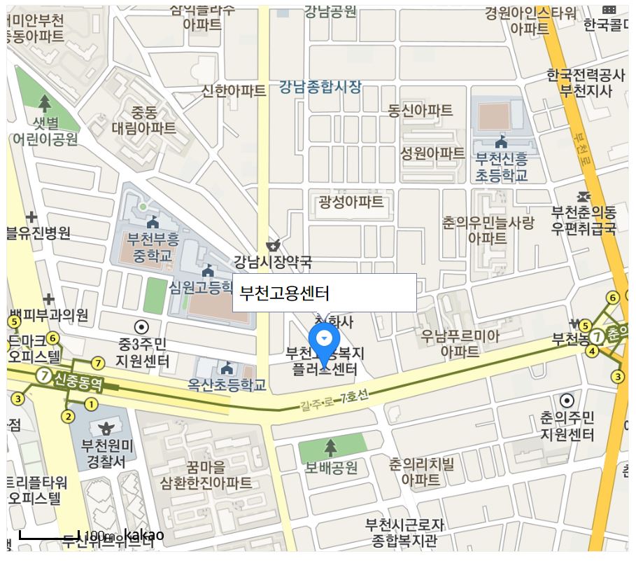부천고용센터는 신중동역(지하철 7호선) 7번 출구와 가까우며 경기도 부천시 원미구 길주로 351입니다.