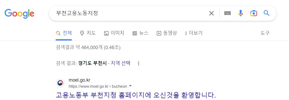 구글 검색창에 부천 고용 노동지청을 입력하면 고용노동부 부천지청 홈페이지가 나옵니다. 여기에 접근하면 부천고용노동지청 홈페이지 이용이 가능합니다.