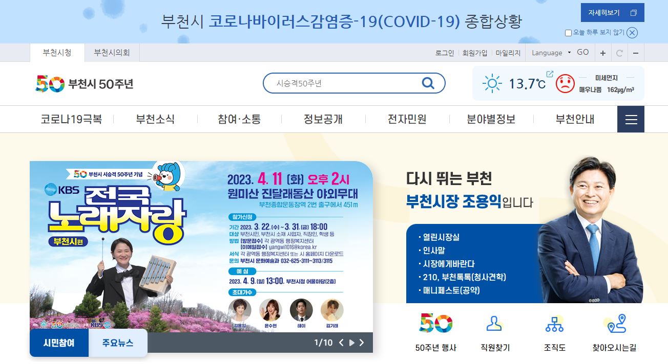 구글 검색창에 부천시청을 입력하면 부천시청 url(http://www.bucheon.go.kr)이 나온다. 여기에 접근하면 부천시청 홈페이지 이용이 가능하다.