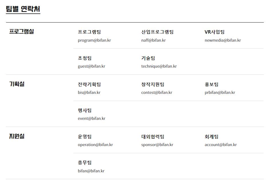 부천판타스틱영화제 팀별 연락처는 이메일 형태로 제공이 되고 있으며 하단 팀별 연락처를 참고하시기 바랍니다.