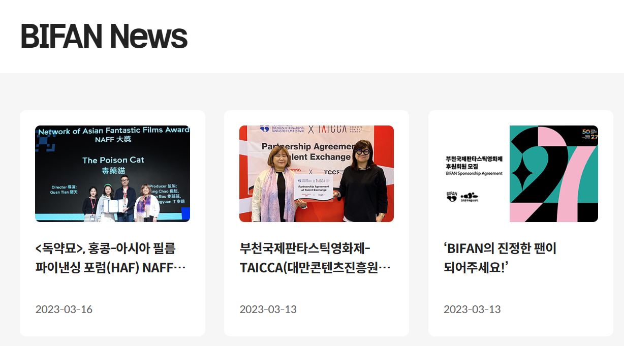 부천판타스틱영화제 홈페이지에는 부천판타스틱영화제 소식이 있습니다.