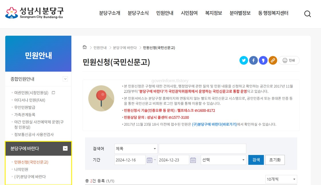 분당구청 민원실 전화번호 이용방법 바로가기 - 분당구청 홈페이지