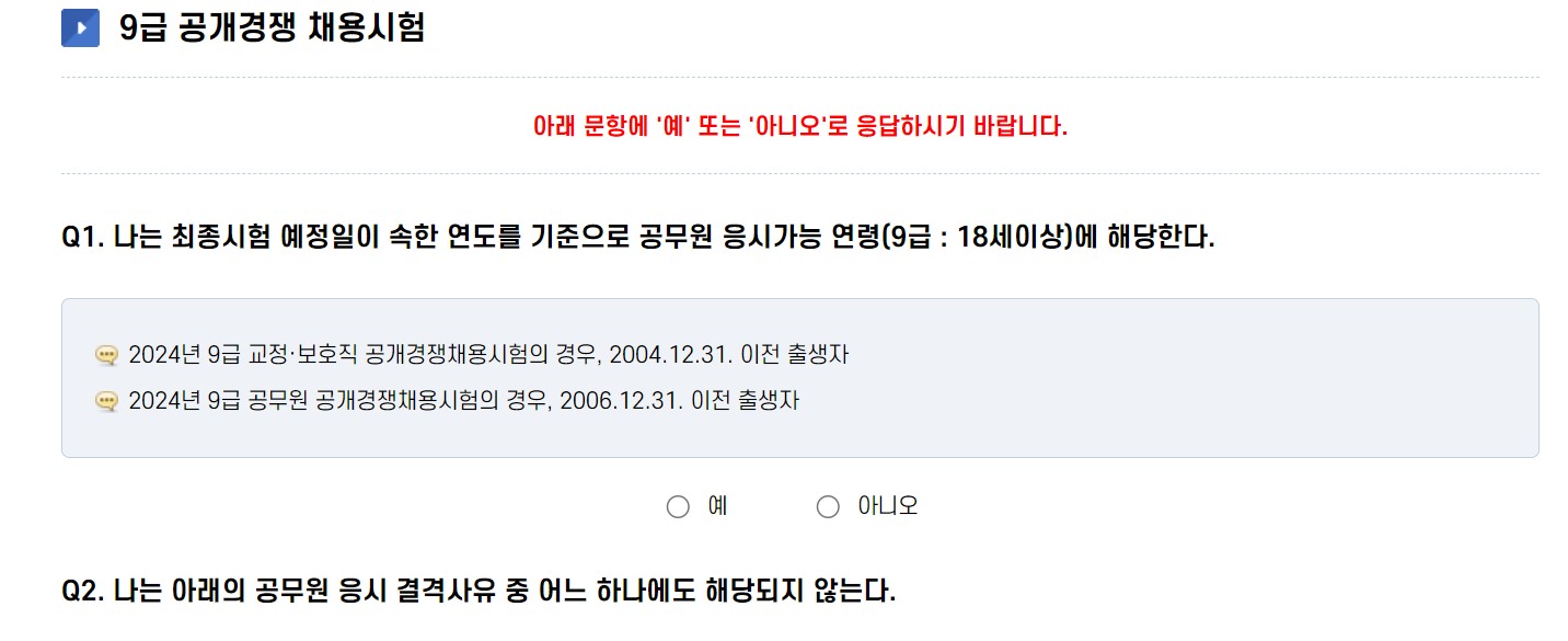 문항에 '예' 또는 '아니오'로 응답하면 됩니다.
