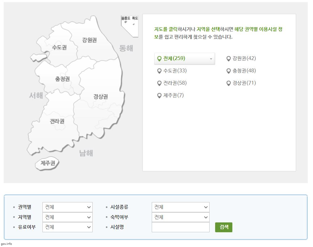 3) 사용가능 시설안내 메뉴에서 지역별 검색하기를 이용하여 이용시설 정보를 확인합니다. 총 259개의 시설이 있습니다. 이 중 이용하고 자하는 시설이 있는지 확인을 하고 기억해 둡니다.