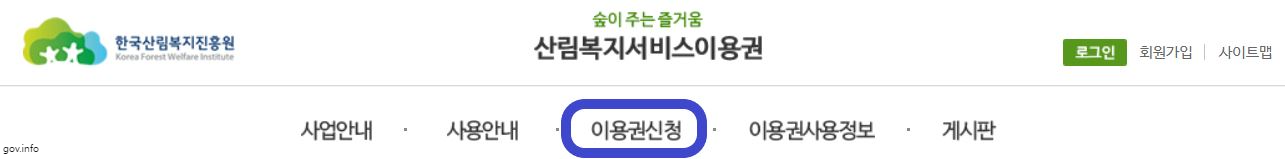 4) 한국산림복지진흥원 홈페이지 첫 화면 상단 메뉴에 '이용권 신청'을 터치하여 이용권 신청을 합니다.