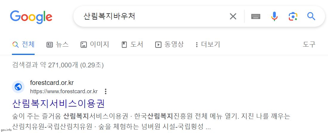 1) 구글이나 평소 이용하는 홈페이지 검색창에 '산림복지바우처'를 입력합니다.