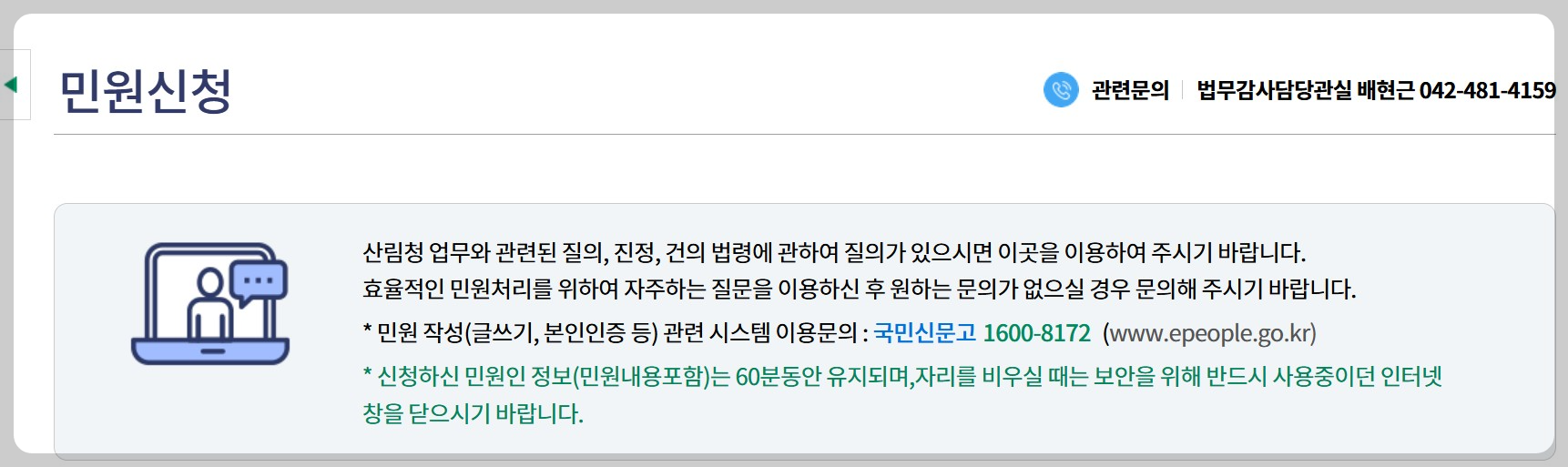 먼저, 산림청 민원 신청 홈페이지에 접속해야 해요. 산림청 민원서비스 사이트에 들어가면 다양한 민원 서비스를 확인할 수 있어요. 문의사항은 국민신문고 고객센터(1600-8172)로 문의하면되요. 국민신문고로 산림청 민원서비스가 자동으로 넘어가기 때문에 문의는 "국민신문고"로!
