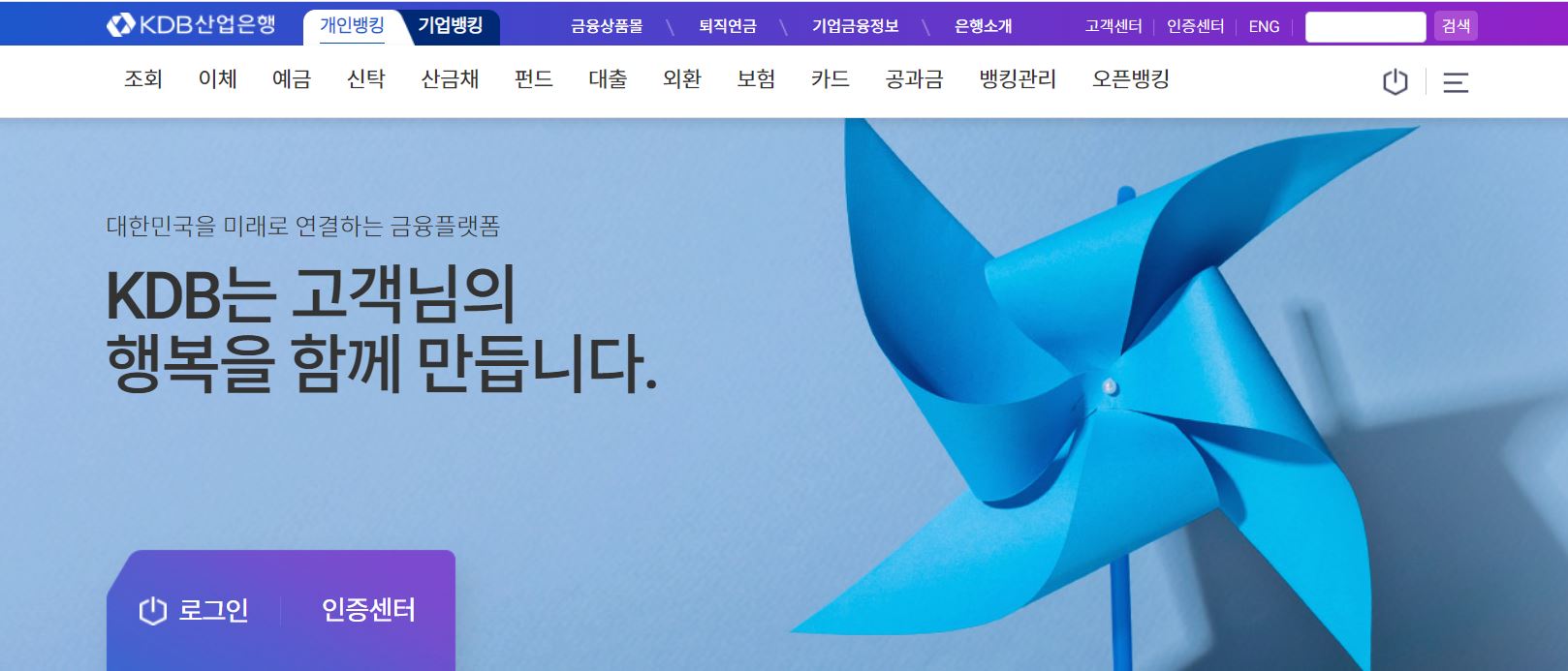 산업은행 인터넷뱅킹 첫 화면입니다.