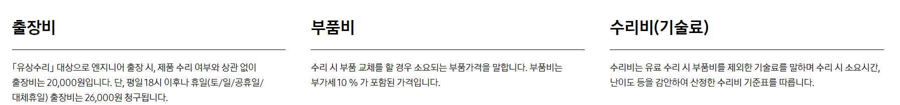 무상수리 대상은 품질보증기간 이내 정상적으로 사용했을때 발생한 성능이나 기능상의 고장인 경우, 제품의 품질보증기간 이내에 부품을 교체하거나 부품을 유상으로 교체한 이후, 정상적으로 제품을 사용하는 과정에서 12개월 이내에 동일한 부품의 재고장 발생인 경우, 부품을 사용하지 않고 수리한 경우 수리날부터 2개월 이내에 정상적으로 제품을 사용하는 과정에서 종전과 동일한 고장이 재발한 경우입니다. 유상수리는 무상보증기간이 경과된 제품 또는 하단의 사유(보증이내, 고객요청, 제품설치, 타사요인 등)인 경우도 해당됩니다.