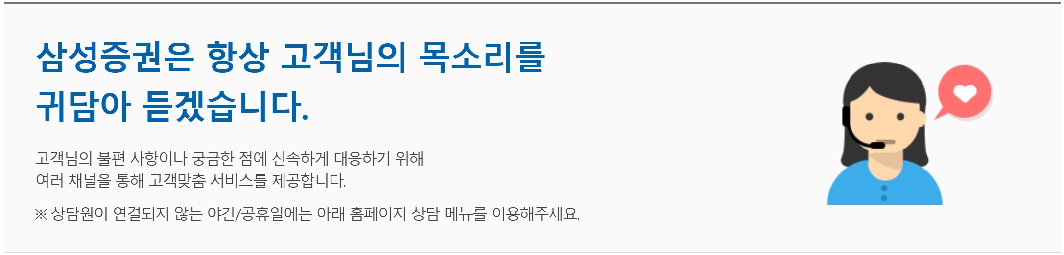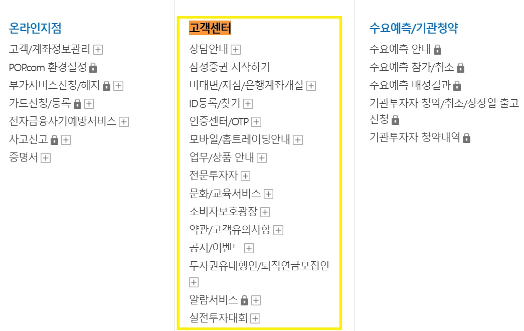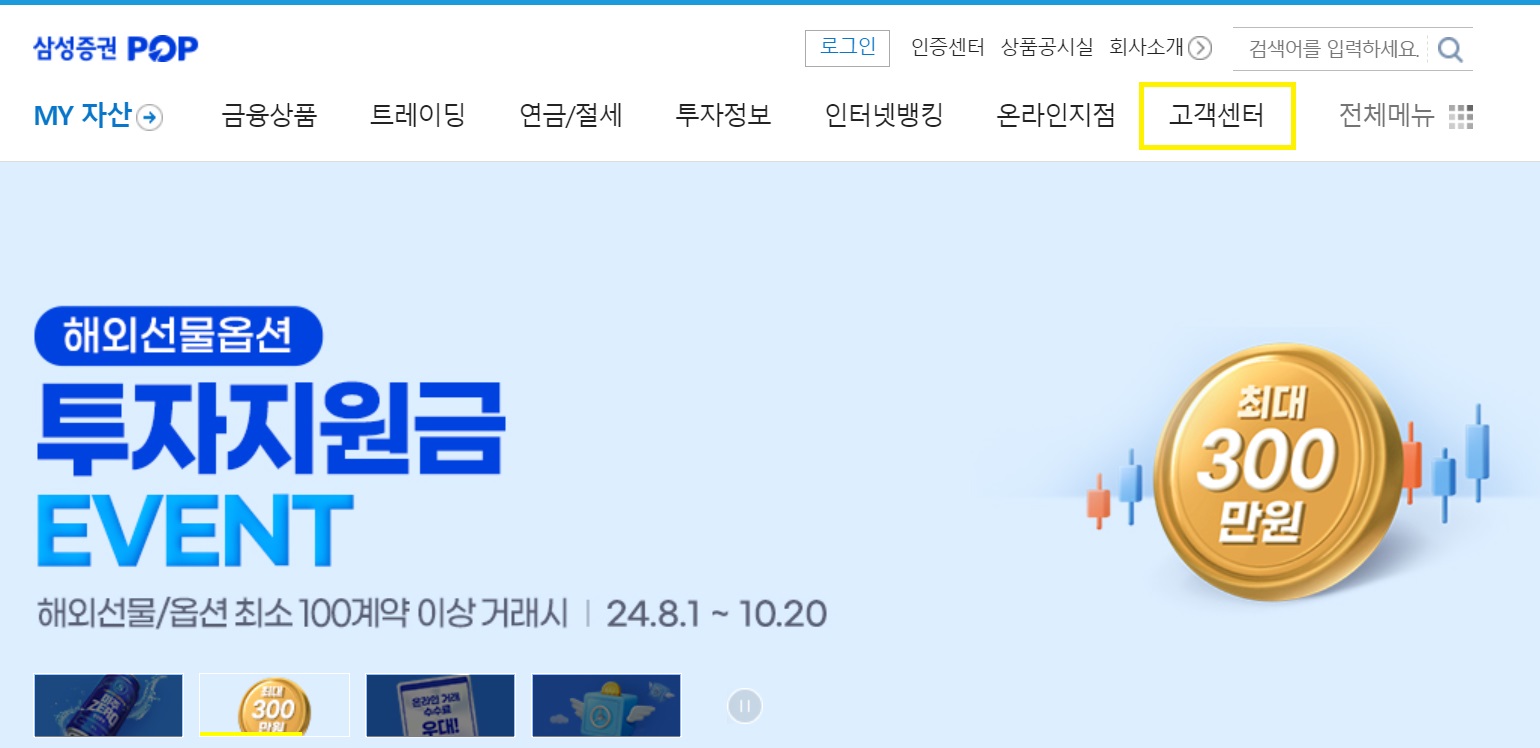 삼성증권 홈페이지(https://www.samsungpop.com/) 메뉴에 보면 고객센터 페이지가 있습니다.
