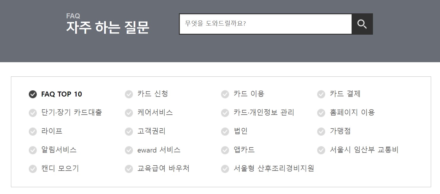 검색어 창에 궁금한 사항을 입력을 합니다. 입력할 수 있는 내용은 삼성카드의 단기 장기 카드대출, 라이프, 알림 서비스, 캔디 모으기, 카드 신청, 케어서비스, 고객권리, eward 서비스, 교육급여 바우처, 카드 이용, 카드 개인정보 관리, 법인, 앱카드, 카드 결제, 홈페이지 이용, 가맹점 등 어떠한 내용도 좋습니다.
