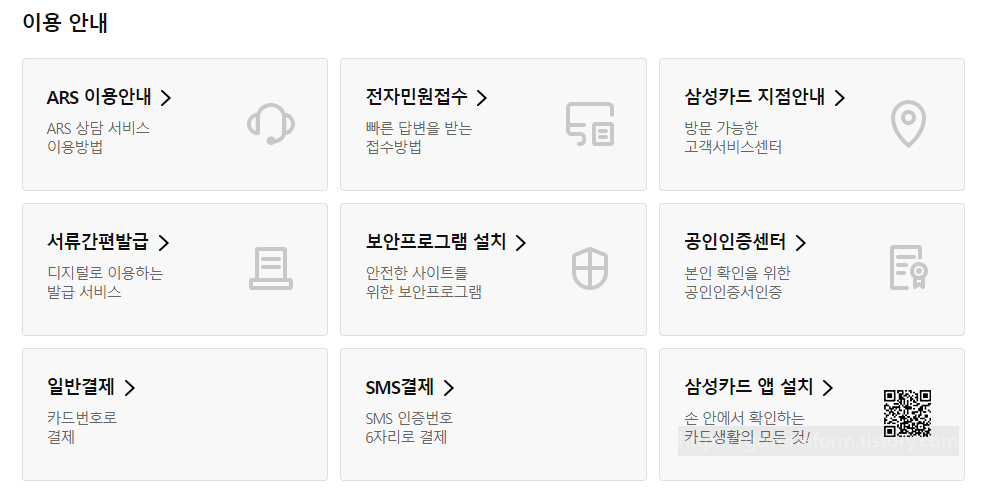 고객센터 이용 안내 메뉴 구성은 다음과 같습니다. ARS 이용안내(ARS 상담 서비스 이용방법), 전자민원접수(빠른 답변을 받는 접수방법), 삼성카드 지점 안내(방문 가능한 고객서비스센터), 서류 간편 발급(디지털로 이용하는 발급 서비스), 보안 프로그램 설치(안전한 사이트를 위한 보안 프로그램), 공인인증센터(본인 확인을 위한 공인인증서 인증), 일반 결제(카드번호로 결제), SMS 결제(인증번호 6자리로 결제), 삼성카드 앱 설치(손 안에서 확인하는 카드생활의 모든 것)가 있습니다. 이 중에서 이용하고자 하는 서비스가 있으면 클릭하여 이용하면 됩니다.