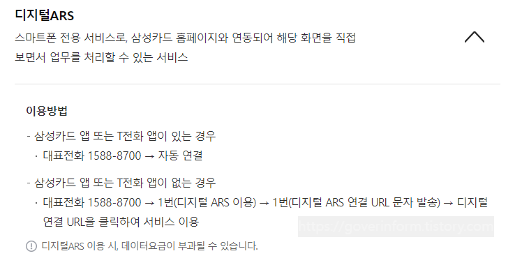 디지털 ARS는 스마트폰 이용 시에만 이용할 수 있는 서비스로 ARS 이용 시 삼성카드 홈페이지와 연결이 되어 화면을 보면서 업무처리를 하는 서비스입니다.