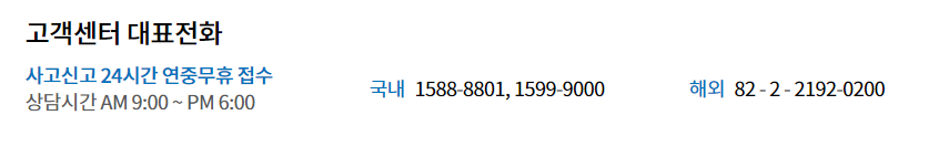 아무렴 가장 흔하게 이용되는건 고객센터 대표전화로 전화를 걸어 상담사와 전화 연결을 통해 상담을 진행하는 것으로 사고신고의 경우 24시간 이용이 가능하고 기본적인 이용문의 및 업무관련 상담은 평일 오전 9시부터 오후 6시까지 이용할수 있다. 국내에서 이용할 경우 1588-8801 또는 1599-9000 이다. 해외에서 이용할 경우에는 번호가 다르니 아래 해외 전용 번호를 참고하기 바란다.