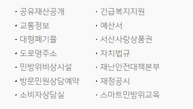 이 외에도 서산시민들에게 유용한 복지지원정보 대형폐기물처리방법에대한안내 스마트민방위교육 그리고 다양한 혜택이 있는 서산사랑상품권에 대한 정보도있습니다.