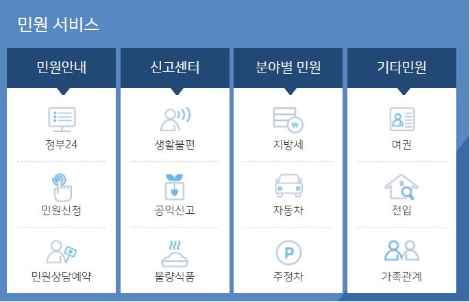 민원서비스를 이용하기쉽게 되어있습니다. 홈페이지 첫화면에가면있습니다. 주정차 여권 가족관계민원은 많은 분들이 이용하는 분야이기도 합니다.