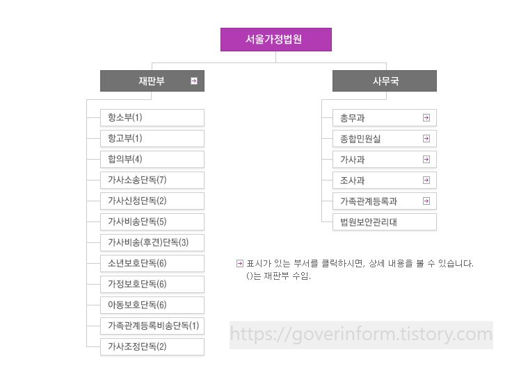 서울가정법원의 조직도 입니다. 재판부와 사무국으로 나누어져있으며 재판부에는 항소부 항고부 합의부를 비롯한 재판을 담당하는 부서가 있으며 사무국은 총무과. 민원실. 가사과. 조사과. 가족관게등록과. 법원보안관리대가 있습니다. 홈페이지에서 화살표를 터치하면 상세 내용을 볼 수 있습니다. 하단 홈페이지 바로가기가 있습니다. 이용 바랍니다.