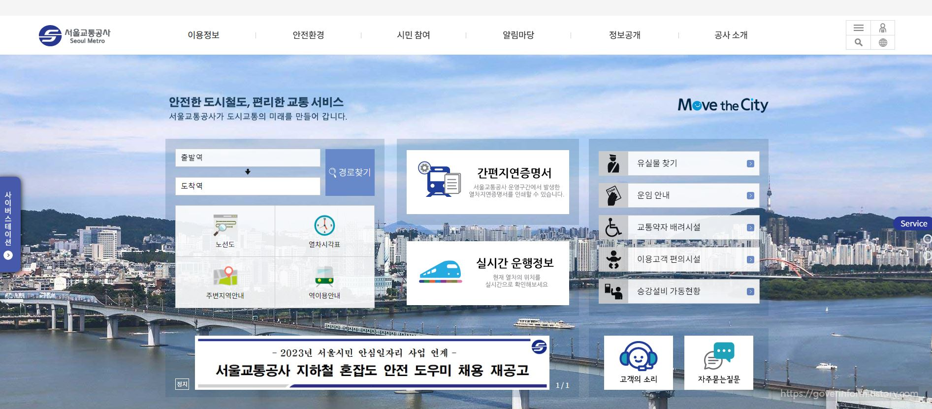 구글검색창에 서울교통공사를 검색하면 서울교통공사 홈페이지url(http://www.seoulmetro.co.kr/kr/index.do)이 나오는데 여기에 접근하면 서울교통공사 홈페이지 이용이 가능합니다.